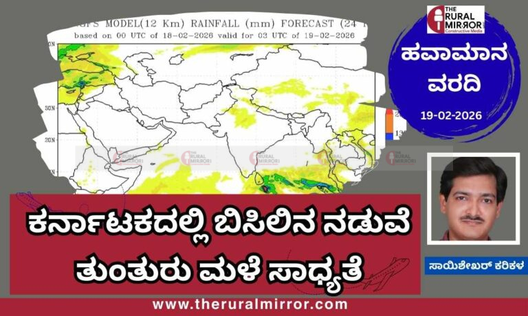 ಶ್ರೀಲಂಕಾ ಸಮೀಪ ಉಂಟಾಗಿರುವ ವಾಯುಭಾರ ಕುಸಿತದ ಪರಿಣಾಮದಿಂದ ಫೆಬ್ರವರಿ 20ರಿಂದ ಕರಾವಳಿ, ಮಲೆನಾಡು ಹಾಗೂ ದಕ್ಷಿಣ ಒಳನಾಡಿನ ಕೆಲವು ಜಿಲ್ಲೆಗಳಲ್ಲಿ ತುಂತುರು ಮಳೆಯಾಗುವ ಸಾಧ್ಯತೆ ಇದೆ. ಉತ್ತರ…