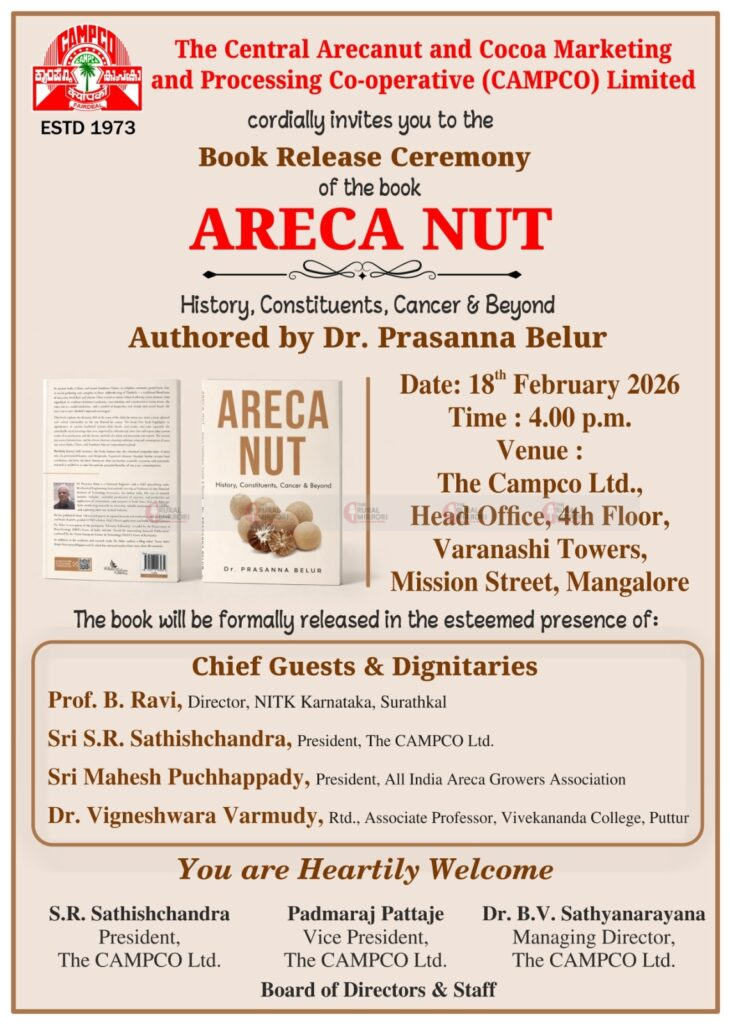 CAMPCO will host the release of the research book “ARECA NUT: History, Constituents, Cancer & Beyond” by NITK Surathkal Professor Dr. Prasanna Belur on February 18, 2026, in Mangaluru. The book explores arecanut’s history, chemical composition, health impacts, and potential industrial applications. Several dignitaries including NITK Director Prof. B. Ravi and CAMPCO President S.R. Satishchandra will attend the event.