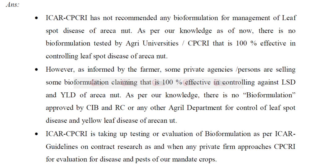 ICAR has clarified that no bio-formulation has been officially recommended or scientifically proven to be 100% effective against arecanut leaf spot or yellow leaf disease. Ongoing field demonstrations in Karnataka are still in progress, and the real effectiveness of any such claims can only be verified after the disease reappears post-monsoon.