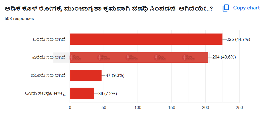 “ಅಡಿಕೆ ಕೊಳೆರೋಗಕ್ಕೆ ಮುಂಜಾಗ್ರತಾ ಕ್ರಮವಾಗಿ ಔಷಧಿ ಸಿಂಪಡಣೆ ಆಗಿದೆಯೇ” ಎಂದು ಪ್ರಶ್ನೆ ಕೇಳಲಾಗಿತ್ತು. ಜುಲೈ ಅಂತ್ಯದವರೆಗೆ ಹಾಗೂ ಸಮೀಕ್ಷೆ ಅಂತ್ಯವಾಗುವವರೆಗೆ ಶೇ 44.7 ಕೃಷಿಕರಿಗೆ ಒಂದು ಬಾರಿ ಸಿಂಪಡಣೆ ಆಗಿತ್ತು. ಶೇ.40.6 ಕೃಷಿಕರಿಗೆ ಎರಡು ಬಾರಿಯ ಸಿಂಪಡಣೆ ಆಗಿತ್ತು, ಶೇ.9.3 ಕೃಷಿಕರಿಗೆ ಮೂರು ಬಾರಿ ಸಿಂಪಡಣೆ ಆಗಿತ್ತು. ಶೇ.7.2 ಕೃಷಿಕರಿಗೆ ಒಂದು ಬಾರಿಯೂ ಔಷಧಿ ಸಿಂಪಡಣೆಗೆ ಸಾಧ್ಯವಾಗಿರಲಿಲ್ಲ.