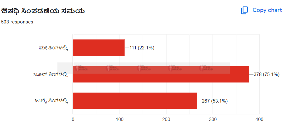 “ಔಷಧಿಯ ಸಿಂಪಡಣೆಯ ಸಮಯ”ದ ಬಗ್ಗೆಯೂ ಕೇಳಲಾಗಿತ್ತು. ಅದರಲ್ಲಿ ಮೇ ತಿಂಗಳಲ್ಲಿ ಶೇ.22.1 ಕೃಷಿಕರಿಗೆ ಸಿಂಪಡಣೆ ಆಗಿದ್ದರೆ, ಶೇ. 75.1ಕೃಷಿಕರಿಗೆ ಜೂನ್ ತಿಂಗಳಲ್ಲಿ ಹಾಗೂ ಶೇ 53.1 ಕೃಷಿಕರಿಗೆ ಜುಲೈ ತಿಂಗಳಲ್ಲಿ ಔಷಧಿ ಸಿಂಪಡಣೆ ಆಗಿತ್ತು. …… ಮುಂದೆ ಓದಿ……