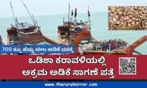 ಒಡಿಶಾ ಕರಾವಳಿಯಲ್ಲಿ ಅಕ್ರಮವಾಗಿ ಸಾಗಿಸಲಾಗುತ್ತಿದ್ದ 700 ಕ್ಕೂ ಹೆಚ್ಚು ಗೋಣಿ ಚೀಲಗಳ ಅಡಿಕೆ ವಶಪಡಿಸಲಾಯಿತು. ಕರಾವಳಿ ಕಾವಲು ಪಡೆ ಕಾರ್ಯಾಚರಣೆಯಲ್ಲಿ ಎರಡು ದೋಣಿಗಳನ್ನು ತಡೆದು ಪರಿಶೀಲನೆ ನಡೆಸಿತು.
