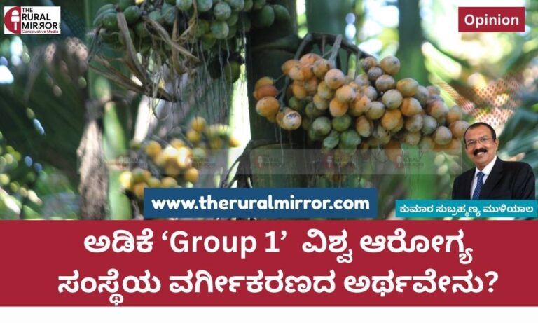 WHO/IARC ಪ್ರಕಾರ ಅಡಿಕೆ Group 1 ವರ್ಗದಲ್ಲಿರುವುದಕ್ಕೆ ಈಗ ಬಲವಾದ ಮಾನವ ಸಾಕ್ಷ್ಯಗಳಿವೆ. Group 1 ಎಂದರೆ “ಅತ್ಯಂತ ವಿಷ” ಅಲ್ಲ, ಮಾನವನಲ್ಲಿ ಕ್ಯಾನ್ಸರ್ ಸಂಬಂಧ ಸಾಬೀತಾಗಿದೆ” ಎಂಬ ವೈಜ್ಞಾನಿಕ ಅರ್ಥ ಮಾತ್ರ. ಮರುವರ್ಗೀಕರಣ ಸಾಧ್ಯತೆ ವಿಜ್ಞಾನಾತ್ಮಕವಾಗಿ ಅತ್ಯಂತ ಕಠಿಣವಾದ ಪ್ರಕ್ರಿಯೆ. ಪ್ರತಿದಿನ ಕೃಷಿ-ಗ್ರಾಮೀಣ-ಪರಿಸರ ಹಾಗೂ ಇತರ ಮಾಹಿತಿಗಾಗಿ ನಮ್ಮ “ದ ರೂರಲ್ ಮಿರರ್.ಕಾಂ”WhatsApp Channel ಗೆ ಇಲ್ಲಿ ಕ್ಲಿಕ್ ಮಾಡಿ