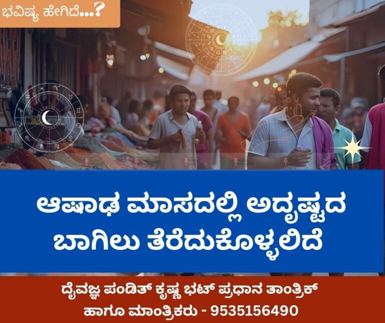 ಮಾಡಬೇಕಾದ ಉಪಾಯಗಳು: ಪ್ರಾತಃಕಾಲ ಶ್ರೀಹರಿಯ ಧ್ಯಾನ – ಜಪ – ” ಓಂ ನಮೋ ಭಗವತೇ ವಾಸುದೇವಾಯ “. ಸೇವಾ ಕಾರ್ಯಗಳಲ್ಲಿ ತೊಡಗಿಸಿಕೊಂಡು ಪುಣ್ಯ ಸಂಪಾದನೆ. ಆಷಾಢ ಮಾಸ ನಿಮ್ಮ ಜೀವನದಲ್ಲಿ ಹೊಸ ಬೆಳಕು ತರಲಿ, ಶುಭದ ಬಾಗಿಲುಗಳು ತೆರೆದು ಅದೃಷ್ಟವೂ ನಿಮ್ಮತ್ತ ಮುಖಮಾಡಲಿ. ಇನ್ನಷ್ಟು ವೈಯಕ್ತಿಕ ಮಾರ್ಗದರ್ಶನ ಬೇಕಾದರೆ ನಿಮ್ಮ ರಾಶಿಚಕ್ರದ ವಿವರ ನೀಡಿ – ರಾಯರ ಪರಮಭಕ್ತರದ ಜ್ಯೋತಿಷಿಗಳನ್ನು ಸಂಪರ್ಕಿಸಿ 9535156490