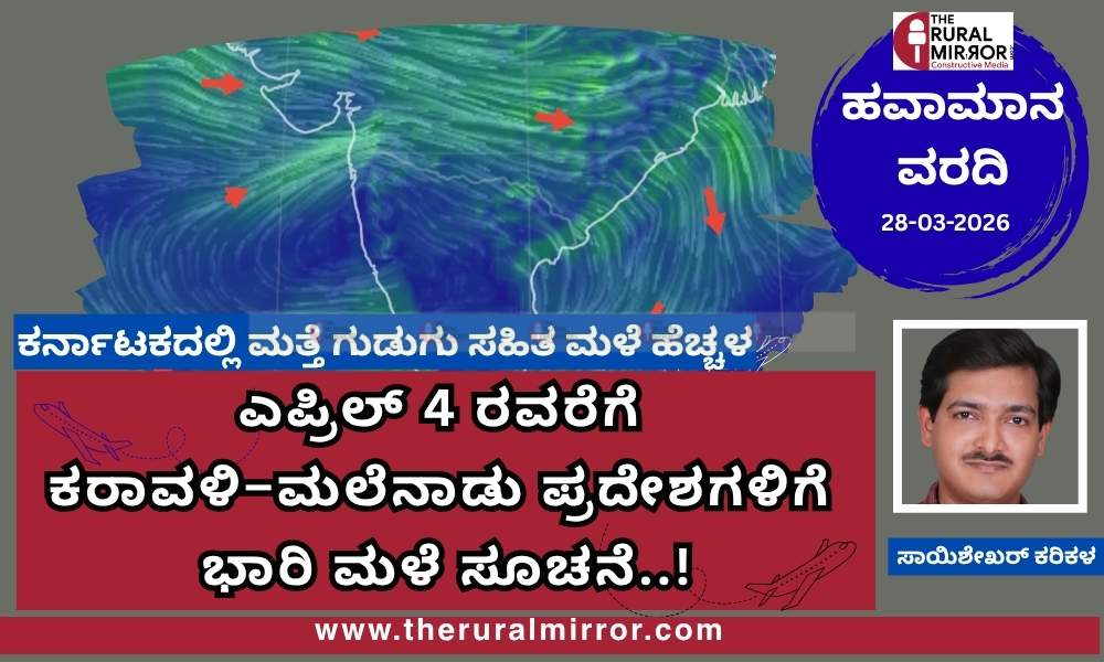 ಹವಾಮಾನ ವರದಿ | 28-03-2026 | ಎಪ್ರಿಲ್ 4 ರವರೆಗೆ ಕರಾವಳಿ–ಮಲೆನಾಡು ಪ್ರದೇಶಗಳಿಗೆ ಭಾರಿ ಮಳೆ ಸೂಚನೆ..!