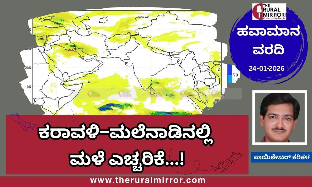 ಹವಾಮಾನ ವರದಿ | 24-01-2026 | ಕರಾವಳಿ–ಮಲೆನಾಡಿನಲ್ಲಿ ಮಳೆ ಎಚ್ಚರಿಕೆ…! ಜ. 27 ರವರೆಗೆ ಮೋಡ–ಗುಡುಗು ಸಾಧ್ಯತೆ