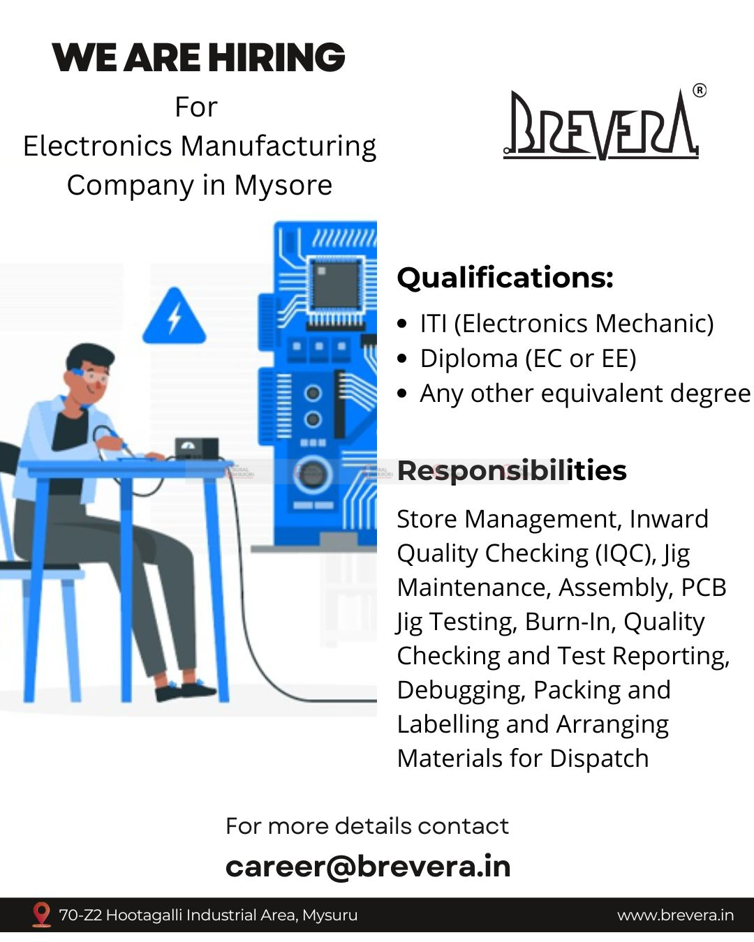 ವಿದ್ಯಾರ್ಹತೆ :ಐಟಿಐ (ಎಲೆಕ್ಟ್ರಾನಿಕ್ಸ್ ಮೆಕ್ಯಾನಿಕ್ ) ಅಥವಾ ಡಿಪ್ಲೊಮಾ (EC ಅಥವಾ EE) ಅಥವಾ ಯಾವುದೇ ಇತರ ಸಮಾನವಾದ ಡಿಗ್ರಿಗಳು. ಆಯ್ಕೆಯಾಗುವ ಅಭ್ಯರ್ಥಿಗಳಿಗೆ ನಿರ್ವಹಣೆ, ಗುಣಮಟ್ಟ ಪರಿಶೀಲನೆ (ಐಕ್ಯೂಸಿ), ನಿರ್ವಹಣೆ, ಜೋಡಣೆ, ಪಿಸಿಬಿ ಪರೀಕ್ಷೆ, ಬರ್ನ್-ಇನ್, ಗುಣಮಟ್ಟ ಪರಿಶೀಲನೆ ಮತ್ತು ಪರೀಕ್ಷಾ ವರದಿ ಮಾಡುವಿಕೆ, ಡೀ ಬಗ್ ಮಾಡುವುದು, ಪ್ಯಾಕಿಂಗ್ ಮತ್ತು ಲೇಬಲಿಂಗ್ ಮತ್ತು ರವಾನೆಗಾಗಿ ಸಾಮಗ್ರಿಗಳನ್ನು ಜೋಡಿಸುವುದು ಇತ್ಯಾದಿ ಕೆಲಸಗಳು ಇರುತ್ತವೆ. ಹೆಚ್ಚಿನ ಮಾಹಿತಿಗೆ ಸಂಪರ್ಕಿಸಿ: 9606013313 ಅಥವಾ [email protected] ಗೆ ಬಯೋಡಾಟಾ ಕಳುಹಿಸಲು ಕೋರಲಾಗಿದೆ.