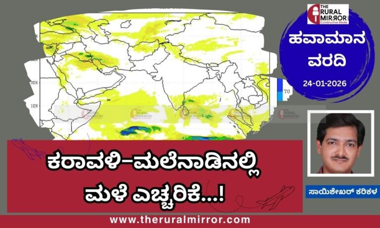 ಉತ್ತರ ಭಾರತದ ಉತ್ತರ ಭಾಗಗಳಲ್ಲಿ ಪ್ರಭಲ ವಾಯುಭಾರ ಕುಸಿತದಂತಹ ತಿರುವಿಕೆಯ ಕಾರಣದಿಂದ ಜಮ್ಮು ಕಾಶ್ಮೀರ, ಹಿಮಾಚಲ ಪ್ರದೇಶ ರಾಜ್ಯಗಳಲ್ಲಿ ಮಳೆ ಅಥವಾ ಭಾರಿ ಹಿಮಪಾತವಾಗುತ್ತಿರುವ ಲಕ್ಷಣಗಳಿದ್ದು, ರಾಜಸ್ಥಾನ, ಪಂಜಾಬ್, ದೆಹಲಿ, ಉತ್ತರಾಖಂಡ, ಉತ್ತರ ಪ್ರದೇಶ ರಾಜ್ಯಗಳಲ್ಲಿ ಜನವರಿ 28ರ ತನಕ ಮಳೆಯ ಮುನ್ಸೂಚನೆ ಇದೆ. ಪ್ರತಿದಿನ ಕೃಷಿ-ಗ್ರಾಮೀಣ-ಪರಿಸರ ಹಾಗೂ ಇತರ ಮಾಹಿತಿಗಾಗಿ ನಮ್ಮ “ದ ರೂರಲ್ ಮಿರರ್.ಕಾಂ”WhatsApp Channel ಗೆ ಇಲ್ಲಿ ಕ್ಲಿಕ್ ಮಾಡಿ