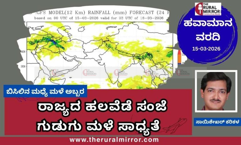 ದಕ್ಷಿಣ ಒಳನಾಡು : ಮೈಸೂರು, ಮಂಡ್ಯ, ಚಾಮರಾಜನಗರ, ರಾಮನಗರ, ಬೆಂಗಳೂರು ಗ್ರಾಮಾಂತರ ಮತ್ತು ನಗರ, ಕೋಲಾರ, ಚಿಕ್ಕಬಳ್ಳಾಪುರ, ತುಮಕೂರು ಹಾಗೂ ಚಿತ್ರದುರ್ಗ ಜಿಲ್ಲೆಗಳಲ್ಲಿ ಸಂಜೆ–ರಾತ್ರಿ ಮೋಡದ ವಾತಾವರಣ ಇರಲಿದೆ. ಇವತ್ತು ಮಳೆಯ ಸಾಧ್ಯತೆ ಕಡಿಮೆ ಇದ್ದರೂ, ತಾಪಮಾನ ಏರಿಕೆಯಿಂದ ಮಾರ್ಚ್ 16ರಿಂದ ಒಂದೆರಡು ಜಿಲ್ಲೆಗಳಲ್ಲಿ ಮಳೆ ಆರಂಭವಾಗುವ ಸಾಧ್ಯತೆ ಇದೆ. ಪ್ರತಿದಿನ ಕೃಷಿ-ಗ್ರಾಮೀಣ-ಪರಿಸರ ಹಾಗೂ ಇತರ ಮಾಹಿತಿಗಾಗಿ ನಮ್ಮ “ದ ರೂರಲ್ ಮಿರರ್.ಕಾಂ”WhatsApp Channel ಗೆ ಇಲ್ಲಿ ಕ್ಲಿಕ್ ಮಾಡಿ