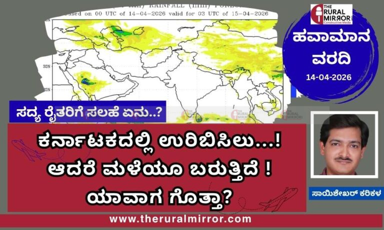 ದಕ್ಷಿಣ ಒಳನಾಡು : ಮೈಸೂರು, ಚಾಮರಾಜನಗರ, ಮಂಡ್ಯ ಜಿಲ್ಲೆಗಳಲ್ಲಿ ರಾತ್ರಿ ಮೋಡದ ವಾತಾವರಣ ಕಂಡುಬರಲಿದೆ. ಉಳಿದ ಭಾಗಗಳಲ್ಲಿ ಸಣ್ಣ ಪ್ರಮಾಣದ ಮೋಡ ಕವಿದ ವಾತಾವರಣ. ಏಪ್ರಿಲ್ 18 ರವರೆಗೆ ಮಳೆಯ ಸಾಧ್ಯತೆ ಕಡಿಮೆ. ಪ್ರತಿದಿನ ಕೃಷಿ-ಗ್ರಾಮೀಣ-ಪರಿಸರ ಹಾಗೂ ಇತರ ಮಾಹಿತಿಗಾಗಿ ನಮ್ಮ “ದ ರೂರಲ್ ಮಿರರ್.ಕಾಂ”WhatsApp Channel ಗೆ ಇಲ್ಲಿ ಕ್ಲಿಕ್ ಮಾಡಿ