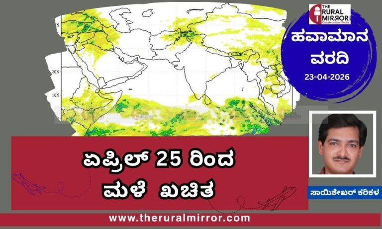 ರಾಜ್ಯದಲ್ಲಿ ಮುಂದಿನ ಎರಡು ದಿನ ಮಳೆಯ ಪ್ರಮಾಣ ಕಡಿಮೆ ಇರಲಿದ್ದು, ಏಪ್ರಿಲ್ 25ರಿಂದ…