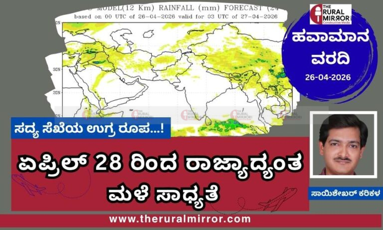 ಆದರೆ ಏಪ್ರಿಲ್ 28ರಿಂದ ಈ ಭಾಗದಲ್ಲಿಯೂ ಮಳೆ ಆರಂಭವಾಗುವ ಲಕ್ಷಣಗಳಿವೆ. ಪ್ರತಿದಿನ ಕೃಷಿ-ಗ್ರಾಮೀಣ-ಪರಿಸರ ಹಾಗೂ ಇತರ ಮಾಹಿತಿಗಾಗಿ ನಮ್ಮ “ದ ರೂರಲ್ ಮಿರರ್.ಕಾಂ”WhatsApp Channel ಗೆ ಇಲ್ಲಿ ಕ್ಲಿಕ್ ಮಾಡಿ