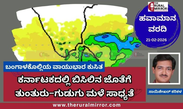 ದಕ್ಷಿಣ ಒಳನಾಡಿನ ಜಿಲ್ಲೆಗಳು : ಮೈಸೂರು, ಚಾಮರಾಜನಗರ ಹಾಗೂ ಮಂಡ್ಯ ಜಿಲ್ಲೆಗಳಲ್ಲಿ ರಾತ್ರಿ ವೇಳೆ ಗುಡುಗು ಸಹಿತ ಸಾಮಾನ್ಯ ಮಳೆಯ ಮುನ್ಸೂಚನೆ ಇದೆ. ಚಿತ್ರದುರ್ಗ ಜಿಲ್ಲೆಯ ಕೆಲವೆಡೆ ತುಂತುರು ಮಳೆಯ ಸಾಧ್ಯತೆ ಇದೆ. ಉಳಿದ ಜಿಲ್ಲೆಗಳಲ್ಲಿ ಮೋಡದ ವಾತಾವರಣ ಕಂಡುಬರುವ ಸಾಧ್ಯತೆ ಇದೆ. ಈ ಪ್ರದೇಶಗಳಲ್ಲಿ ಫೆಬ್ರವರಿ 27ರವರೆಗೆ ಬಿಸಿಲಿನ ಜೊತೆಗೆ ತುಂತುರು ಮಳೆಯ ಮಿಶ್ರ ವಾತಾವರಣ ಮುಂದುವರಿಯುವ ಸಾಧ್ಯತೆ ಇದೆ. ಪ್ರತಿದಿನ ಕೃಷಿ-ಗ್ರಾಮೀಣ-ಪರಿಸರ ಹಾಗೂ ಇತರ ಮಾಹಿತಿಗಾಗಿ ನಮ್ಮ “ದ ರೂರಲ್ ಮಿರರ್.ಕಾಂ”WhatsApp Channel ಗೆ ಇಲ್ಲಿ ಕ್ಲಿಕ್ ಮಾಡಿ