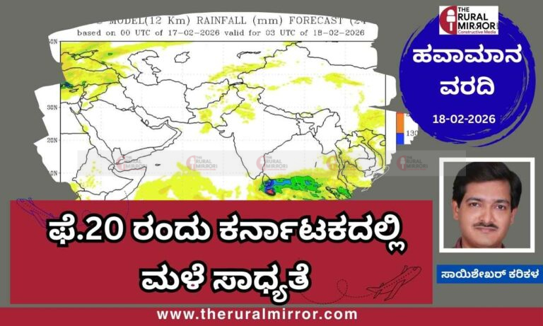 ಮಲೆನಾಡಿನಲ್ಲಿ ತುಂತುರು ಮಳೆ ಮುನ್ಸೂಚನೆ : ಕೊಡಗು ಜಿಲ್ಲೆಯ ಕೆಲವು ಭಾಗಗಳು ಹಾಗೂ ಹಾಸನ, ಚಿಕ್ಕಮಗಳೂರು ಮತ್ತು ಶಿವಮೊಗ್ಗ ಜಿಲ್ಲೆಗಳ ಹೆಚ್ಚಿನ ಪ್ರದೇಶಗಳಲ್ಲಿ ಮೋಡದ ವಾತಾವರಣ ಕಂಡುಬರುತ್ತಿದೆ. ಚಿಕ್ಕಮಗಳೂರಿನ ಮೂಡಿಗೆರೆ, ಬಾಳೆಹೊನ್ನೂರು, ಕುದುರೆಮುಖ ಮತ್ತು ಶಿವಮೊಗ್ಗ ಜಿಲ್ಲೆಯ ಆಗುಂಬೆ ಸುತ್ತಮುತ್ತ ಭಾಗಗಳಲ್ಲಿ ಸಂಜೆ ವೇಳೆಗೆ ತುಂತುರು ಮಳೆಯಾಗುವ ಸಾಧ್ಯತೆ ಇದೆ. ಫೆಬ್ರವರಿ 19 ನಂತರ ಮಲೆನಾಡಿನ ವಿವಿಧ ಭಾಗಗಳಲ್ಲಿ ಸಾಮಾನ್ಯ ಮಳೆಯ ಮುನ್ಸೂಚನೆ ನೀಡಲಾಗಿದೆ.