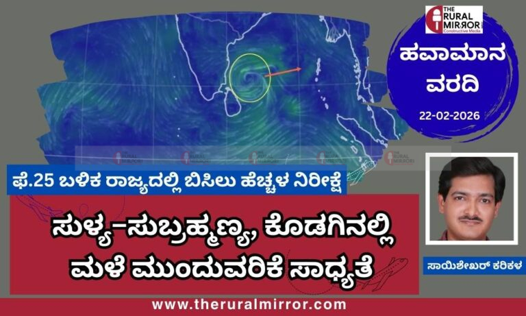 Rain is expected in parts of Coastal Karnataka, especially Sullia and Subrahmanya, and in Kodagu district until February 27, 2026. However, as the low-pressure system over the Bay of Bengal moves eastward, rainfall will decrease, and most districts in Karnataka are likely to experience sunny and dry weather with rising temperatures after February 25, 2026.