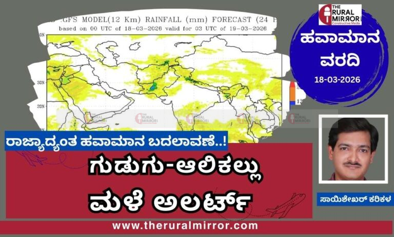 ರಾಜ್ಯದಲ್ಲಿ ಈ ಮಳೆಯ ಚಟುವಟಿಕೆಗಳು ಮಾರ್ಚ್ 20ರವರೆಗೆ ಮುಂದುವರಿಯುವ ಲಕ್ಷಣಗಳಿದ್ದು, ಬಳಿಕ ಮಾರ್ಚ್ 25 ಅಥವಾ 27ರವರೆಗೆ ಕರಾವಳಿಯ ಕಾಸರಗೋಡು, ದಕ್ಷಿಣ ಕನ್ನಡ, ಉಡುಪಿ ಜಿಲ್ಲೆಗಳು ಹಾಗೂ ಮಲೆನಾಡಿನ ಕೊಡಗು ಜಿಲ್ಲೆಯಲ್ಲಿ ಮಳೆ ಮುಂದುವರಿಯುವ ಸಾಧ್ಯತೆ ಇದೆ. ಪ್ರತಿದಿನ ಕೃಷಿ-ಗ್ರಾಮೀಣ-ಪರಿಸರ ಹಾಗೂ ಇತರ ಮಾಹಿತಿಗಾಗಿ ನಮ್ಮ “ದ ರೂರಲ್ ಮಿರರ್.ಕಾಂ”WhatsApp Channel ಗೆ ಇಲ್ಲಿ ಕ್ಲಿಕ್ ಮಾಡಿ