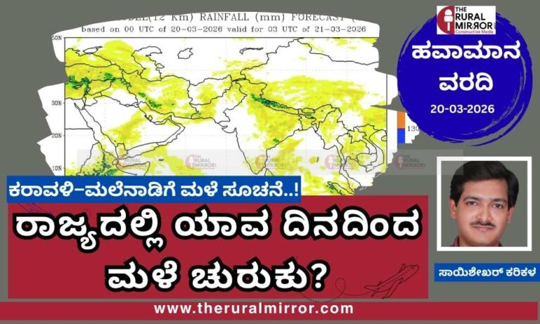 ಸಧ್ಯಕ್ಕೆ ಮಳೆಯ ಲಕ್ಷಣ ಕಾಣಿಸುತ್ತಿಲ್ಲ. ಆದರೆ ಮಾರ್ಚ್ 24ರಿಂದ ಮೋಡದ ಪ್ರಮಾಣ ಹೆಚ್ಚಾಗುವ ಸಾಧ್ಯತೆ ಇದೆ. ಪ್ರತಿದಿನ ಕೃಷಿ-ಗ್ರಾಮೀಣ-ಪರಿಸರ ಹಾಗೂ ಇತರ ಮಾಹಿತಿಗಾಗಿ ನಮ್ಮ “ದ ರೂರಲ್ ಮಿರರ್.ಕಾಂ”WhatsApp Channel ಗೆ ಇಲ್ಲಿ ಕ್ಲಿಕ್ ಮಾಡಿ
