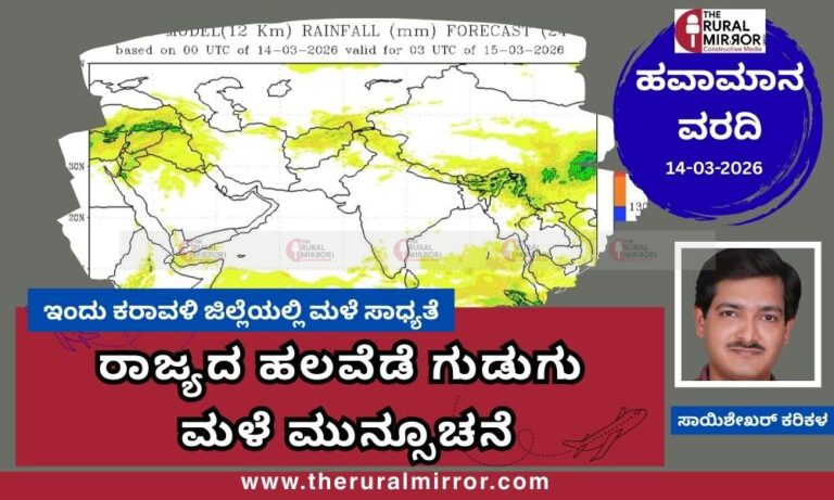 ಉತ್ತರ ಭಾರತದ ಮಧ್ಯಮ ಸ್ತರದಲ್ಲಿ ಉಂಟಾದ ಉಷ್ಣ ಮಾರುತ ಪರಿಚಲನ (Anti-Cyclonic Circulation) ವಿಸ್ತಾರಗೊಂಡ ಪರಿಣಾಮವಾಗಿ ಬಂಗಾಳಕೊಲ್ಲಿಯಿಂದ ಬೀಸುವ ಗಾಳಿಯ ಪ್ರಭಾವ ಹೆಚ್ಚಾಗಿದೆ. ಇದರಿಂದ ಮುಂದಿನ ಒಂದು ವಾರ ಮಲೆನಾಡು ಮತ್ತು ಕರಾವಳಿ ಜಿಲ್ಲೆಗಳಲ್ಲಿ ಮಳೆಯ ಚಟುವಟಿಕೆ ಹೆಚ್ಚುವ ಸಾಧ್ಯತೆ ಇದೆ. ಮಾರ್ಚ್ 17ರಿಂದ 19ರವರೆಗೆ ರಾಜ್ಯದ ಉತ್ತರ ಹಾಗೂ ದಕ್ಷಿಣ ಒಳನಾಡು ಜಿಲ್ಲೆಗಳಲ್ಲಿಯೂ ಗುಡುಗು ಸಹಿತ ಮಳೆಯ ಸಾಧ್ಯತೆ ವ್ಯಕ್ತವಾಗಿದೆ. ಪ್ರತಿದಿನ ಕೃಷಿ-ಗ್ರಾಮೀಣ-ಪರಿಸರ ಹಾಗೂ ಇತರ ಮಾಹಿತಿಗಾಗಿ ನಮ್ಮ “ದ ರೂರಲ್ ಮಿರರ್.ಕಾಂ”WhatsApp Channel ಗೆ ಇಲ್ಲಿ ಕ್ಲಿಕ್ ಮಾಡಿ
