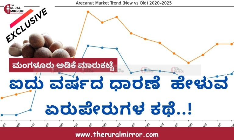 2025 – ಪುನರುಜ್ಜೀವನದ ಸಂಕೇತ : 2025 ರಲ್ಲಿ ಮತ್ತೆ ಚೇತರಿಕೆಯ ಲಕ್ಷಣಗಳು ಗೋಚರಿಸುತ್ತವೆ. ಮಾರ್ಚ್ನಲ್ಲಿ ಹೊಸ ಅಡಿಕೆ ₹408 ಮತ್ತು ಹಳೆಯ ಅಡಿಕೆ ₹475 ತಲುಪಿದ್ದು, ಮಾರುಕಟ್ಟೆ ಪುನಃ ಏರಿಕೆಯ ಹಾದಿಗೆ ಮರಳುತ್ತಿರುವ ಸೂಚನೆ ನೀಡಿದೆ. ಪ್ರತಿದಿನ ಕೃಷಿ-ಗ್ರಾಮೀಣ-ಪರಿಸರ ಹಾಗೂ ಇತರ ಮಾಹಿತಿಗಾಗಿ ನಮ್ಮ “ದ ರೂರಲ್ ಮಿರರ್.ಕಾಂ”WhatsApp Channel ಗೆ ಇಲ್ಲಿ ಕ್ಲಿಕ್ ಮಾಡಿ