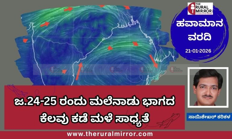 ದಕ್ಷಿಣ ಭಾರತಕ್ಕೆ ಮಳೆಯ ಸೂಚನೆ: ಬಂಗಾಳಕೊಲ್ಲಿಯಲ್ಲಿ ಉಷ್ಣ ಮಾರುತಗಳ ಪರಿಚಲನೆ (Anti-Cyclonic Circulation) ಉಂಟಾಗುವ ಲಕ್ಷಣಗಳು ಕಂಡುಬಂದಿದ್ದು, ತಮಿಳುನಾಡು ಮೂಲಕ ಬೀಸುವ ತೇವಾಂಶಭರಿತ ಗಾಳಿಯ ಪರಿಣಾಮದಿಂದ ತಮಿಳುನಾಡು, ಕೇರಳ ಹಾಗೂ ಕರ್ನಾಟಕದ ದಕ್ಷಿಣ ಒಳನಾಡು, ಮಲೆನಾಡು ಭಾಗಗಳಲ್ಲಿ ಜನವರಿ 24ರಿಂದ 26ರವರೆಗೆ ಅಲ್ಲಲ್ಲಿ ಮಳೆಯ ಮುನ್ಸೂಚನೆ ಇದೆ. The Rural Mirror Epaper & Date : 2026-01-21 (Page 4) https://epaper.theruralmirror.com/hd.php?date=2026-01-21&page=4
