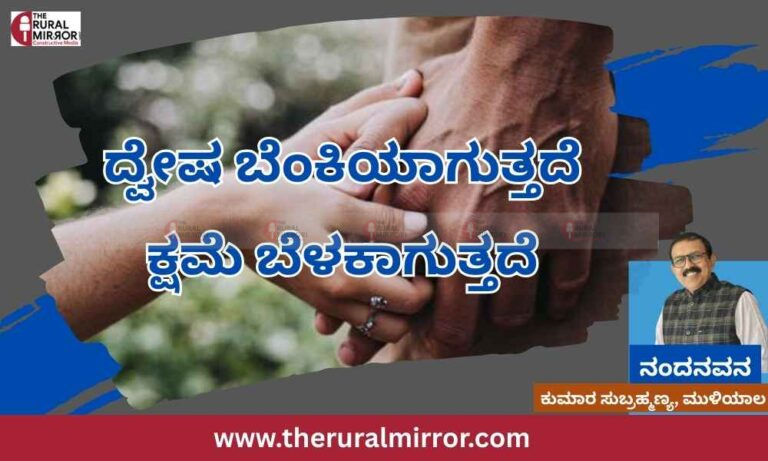 ಕ್ಷಮೆ ಮತ್ತು ದ್ವೇಷ—ಈ ಎರಡು ಮನೋಭಾವಗಳು ವ್ಯಕ್ತಿಯ ಜೀವನದ ದಿಕ್ಕನ್ನು ನಿರ್ಧರಿಸುತ್ತವೆ. ದ್ವೇಷ ನಾಶಮಾಡುವ ಶಕ್ತಿ; ಕ್ಷಮೆ ನಿರ್ಮಿಸುವ ಶಕ್ತಿ. ದ್ವೇಷದ ಬೆಂಕಿ ಕ್ಷಣಮಾತ್ರದಲ್ಲಿ ದಹನ ಉಂಟುಮಾಡಿದರೂ, ಕ್ಷಮೆಯ ಬೀಜ ನಿಧಾನವಾಗಿ ಬೆಳೆದು ಶಾಶ್ವತ ಶಾಂತಿಯ ಫಲವನ್ನು ನೀಡುತ್ತದೆ. ಪ್ರತಿದಿನ ಕೃಷಿ-ಗ್ರಾಮೀಣ-ಪರಿಸರ ಹಾಗೂ ಇತರ ಮಾಹಿತಿಗಾಗಿ ನಮ್ಮ “ದ ರೂರಲ್ ಮಿರರ್.ಕಾಂ”WhatsApp Channel ಗೆ ಇಲ್ಲಿ ಕ್ಲಿಕ್ ಮಾಡಿ