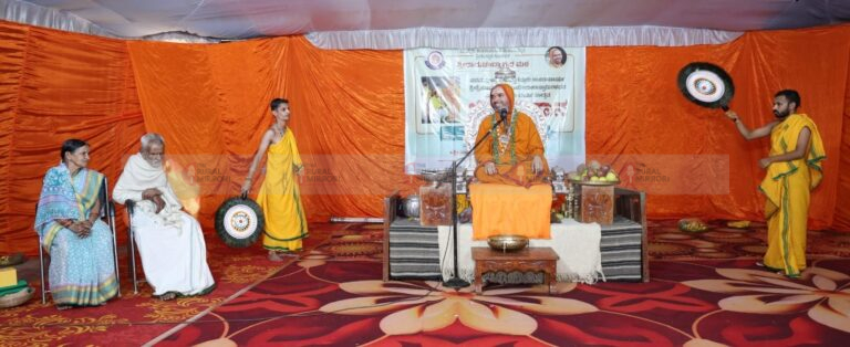 Jagadguru Sri Raghaveshwara Bharati Swamiji emphasized that true peace comes from sharing and helping those in need rather than pursuing wealth or power. During the annual “Jeevanadana” programme marking his sanyasa day, a distressed elderly family was granted lifetime support by the Math.