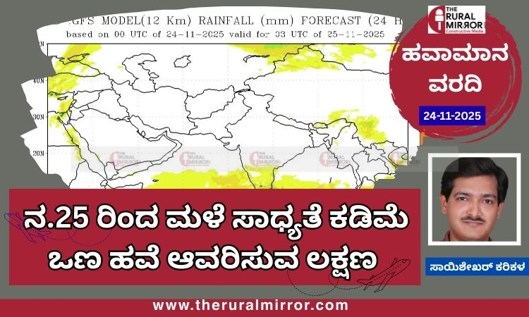 ಹವಾಮಾನ ವರದಿ | 24 – 11 -2025 | ನ.25 ರಿಂದ ಮಳೆ ಸಾಧ್ಯತೆ ಕಡಿಮೆ – ಒಣ ಹವೆ ಆವರಿಸುವ ಲಕ್ಷಣ