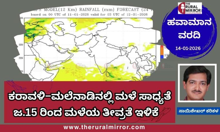 15.01.2026 ಬೆಳಿಗ್ಗೆ 8 ಗಂಟೆವರೆಗಿನ ಕರ್ನಾಟಕದ ಹವಾಮಾನ ಮುನ್ಸೂಚನೆ ಕರಾವಳಿ ಜಿಲ್ಲೆಗಳು : ಕಾಸರಗೋಡು, ಉಡುಪಿ ಹಾಗೂ ಉತ್ತರ ಕನ್ನಡ ಜಿಲ್ಲೆಗಳಲ್ಲಿ ಬಿಸಿಲು ಹಾಗೂ ಅಲ್ಲಲ್ಲಿ ಭಾಗಶಃ…