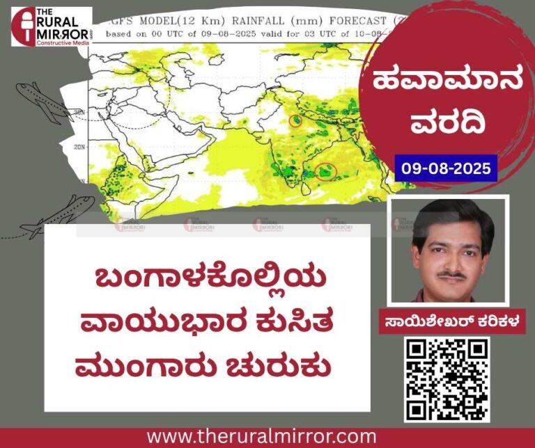 ಕರಾವಳಿ : ರಾಜ್ಯದ ಕರಾವಳಿ ಜಿಲ್ಲೆಗಳಾದ್ಯಂತ ಬಿಸಿಲು ಹಾಗೂ ಮೋಡದ ವಾತಾವರಣದ ಮುನ್ಸೂಚನೆ ಇದೆ. ಕಾಸರಗೋಡು ಹಾಗೂ ದಕ್ಷಿಣ ಕನ್ನಡದ ಜಿಲ್ಲೆಗಳಲ್ಲಿ ಮಧ್ಯಾಹ್ನದ ನಂತರ, ಸಂಜೆ, ರಾತ್ರಿ ಅಲ್ಲಲ್ಲಿ ಒಂದೆರಡು ಸಾಮಾನ್ಯ ಮಳೆಯ ಮುನ್ಸೂಚನೆ ಇದೆ. ಘಟ್ಟದ ಕೆಳಗಿನ ಪ್ರದೇಶಗಳಲ್ಲಿ ಗುಡುಗು ಸಹಿತ ಸಾಮಾನ್ಯ ಮಳೆಯ ಸಾಧ್ಯತೆಗಳಿವೆ. ಈಗಿನಂತೆ ಆಗಸ್ಟ್ 12 ರ ತನಕ ಇದೇ ವಾತಾವರಣ ಮುಂದುವರಿಯುವ ಸಾಧ್ಯತೆಗಳಿದ್ದು, 13 ರಿಂದ ಒಂದೆರಡು ಮಳೆ ಹೆಚ್ಚಾಗುವ ನಿರೀಕ್ಷೆ ಇದೆ. ಆಗಷ್ಟ್ 14 ಅಥವಾ 15ರಿಂದ ಬಂಗಾಳಕೊಲ್ಲಿಯ ವಾಯುಭಾರ ಕುಸಿತದ ಪರಿಣಾಮದಿಂದ ( ಈಗ ತಮಿಳುನಾಡು ಕರಾವಳಿ ಸಮೀಪ ಇದೆ) ಮುಂಗಾರು ಸ್ವಲ್ಪ ಚುರುಕಾಗುವ ಸೂಚನೆಗಳಿವೆ.
